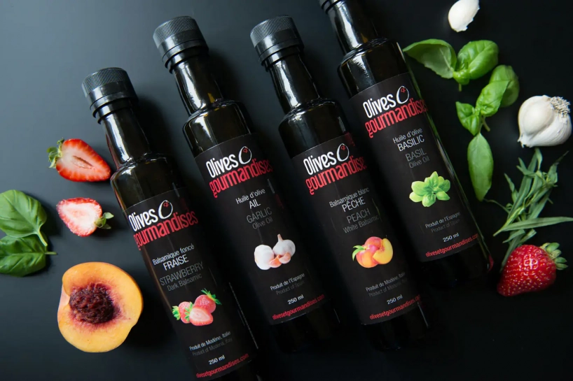 Ainsi que toute notre variété d'huiles et vinaigres vendus séparément aux mille et une saveurs.